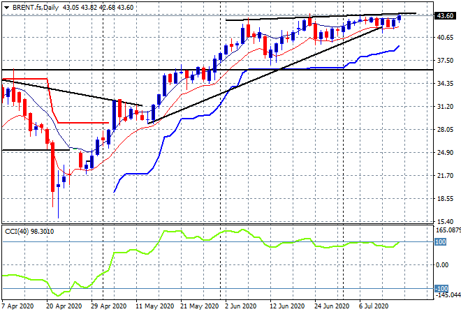 Oil prices regained somewhat overnight with Brent futures closing nearly 1% higher to the $43.60USD per barrel level, finally making a new daily high. Daily momentum is slowly picking up here again, with price finding support but I still contend it requires a burst through the $44 mark to get going: