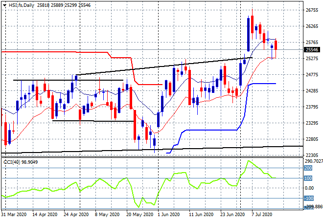 Looking at share markets in Asia from yesterday where the selling was confined to Chyna, where the Shanghai Composite is down nearly 1.5% to 3361 points while in Hong Kong the Hang Seng Index eventually eked out a scratch session to close right on 25481 points. The daily chart shows price remaining just above the previous series of highs at the 25200 points level, indicating that while there’s no upside here yet, the bears are not in charge: