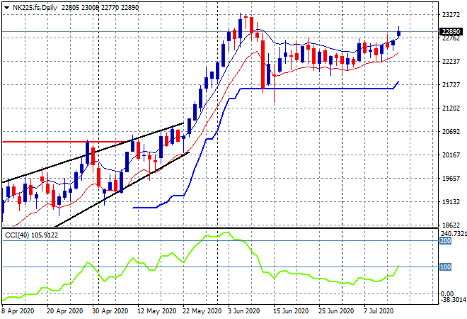 Japanese stocks came back strongly after the previous stumble, with the Nikkei 225 surging over 1.5% higher to close at 22945 points. Futures are lifting higher into another breakout position towards the 23000 point level as momentum picks up strongly on the daily chart. The target for this move is the early June highs, not far away: