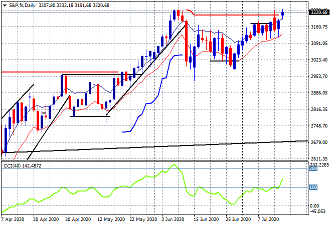 Wall Street had wide ranging sessions again, but the big three bourses all finished well into positive space with the broader S&P500 up nearly 1% to 3226 points. The daily chart shows how price is matching the previous highs, but not exceeding them and a wider view of the chart shows this as a substantial resistance level to get past. Support remains strong at the 3100 point level, so failing a surprise on earnings, with momentum already cooked, this should leap higher: