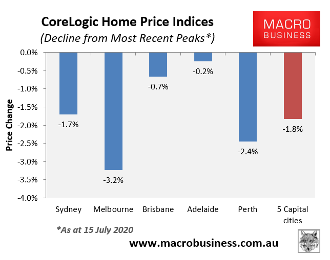 And since peaking on 6 April, Melbourne dwelling values have fallen by 3.2%, almost double Sydney’s fall: