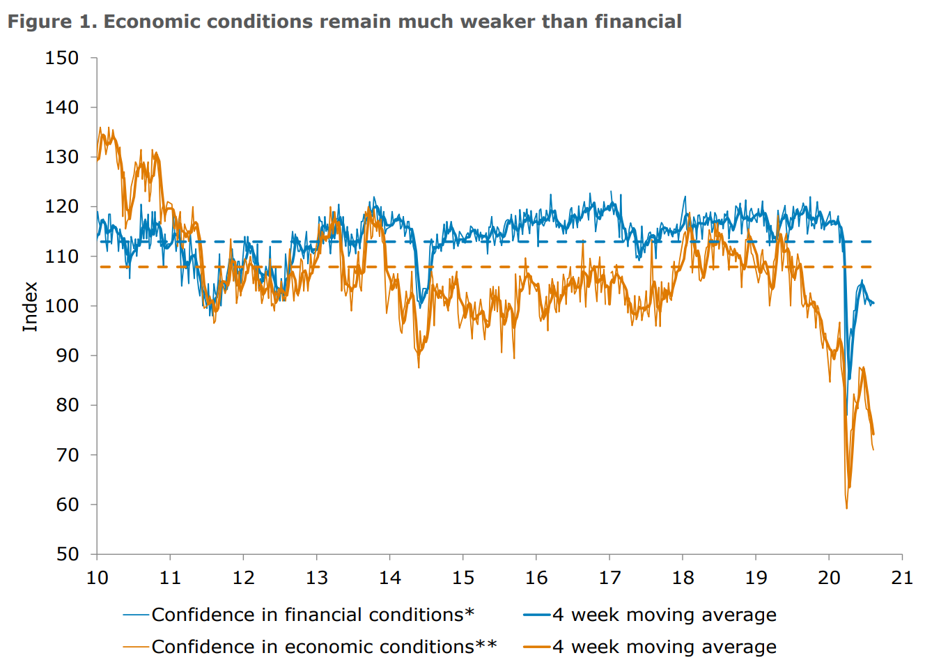 Economic conditions were also mixed. ‘Current economic conditions’ plunged by 8.2%, its eighth weekly decline. This sub-index is now down by 30% over the past seven weeks compared to the fall of 60% in the first wave. ‘Future economic conditions’ ended on a positive note, gaining 2.2%.