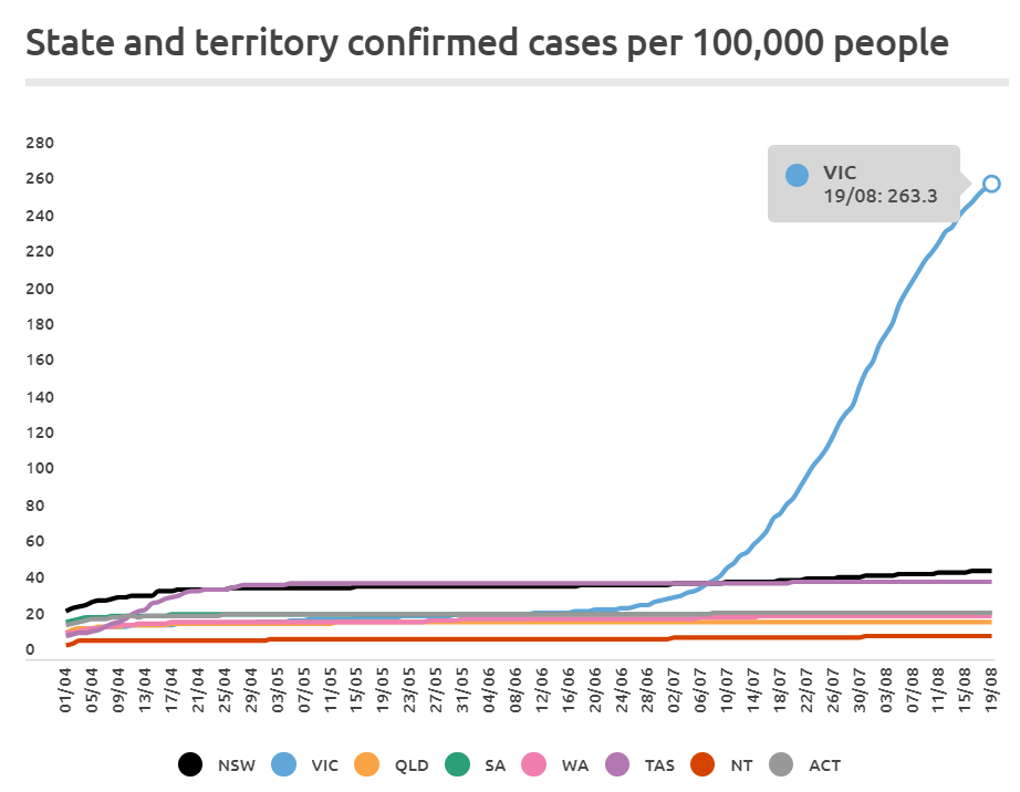 So, while Victoria’s cases went exponential, New South Wales’ remained steady: