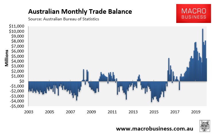 The Australian Bureau of Statistics (ABS) released trade data for the month of July, which registered a sharp fall in Australia’s trade surplus to $4,607 amid falling exports and rising imports: