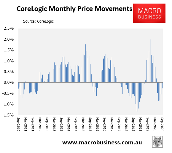 CoreLogic’s dwelling value results for September are out at the 5-city level, with values falling another 0.27% over the month, driven purely by Melbourne and Sydney: