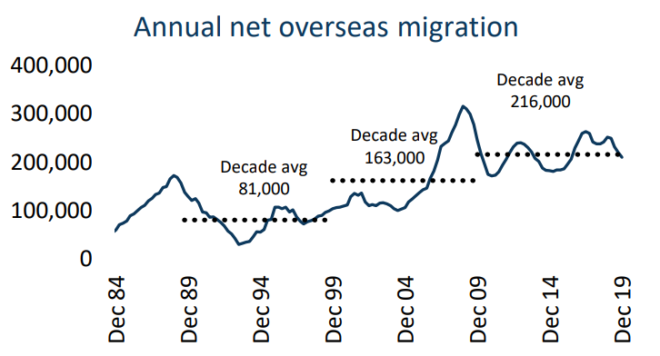 If the Treasury forecasts are right, this means the rate of population growth (a proxy for underlying housing demand) will be the lowest since 1917. Most of the forecast decline in population growth is due to stalled net overseas migration, which is expected to drop from around 232,000 net migrants in the 2018/19 financial year to just 31,000 in 2020/21. This will be disruptive to housing demand. However, the impact will not be evenly spread…