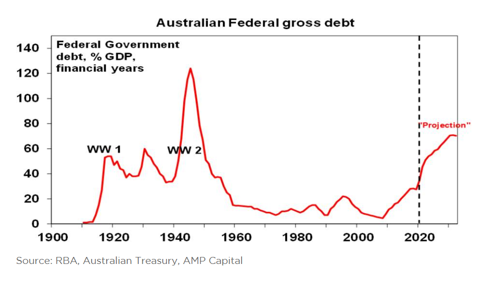 The current situation is not new. A similar challenge was faced after WW2. During WW2 the Federal Government’s budget deficit increased to a record 27% of GDP as a result of war time expenses. This was more than double the likely peak in the budget deficit this year of around 12% of GDP. See next chart.
