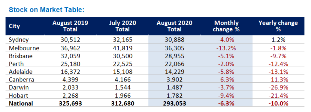 SQM Research has released its stock on market data for August, which reported large monthly and annual declines in the number of properties listed for sale: