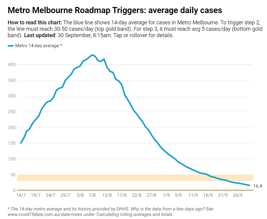 And Melbourne’s 14 day average of new infections has fallen to 16.4, grinding towards the magical 5 case average required to ease current draconian restrictions: