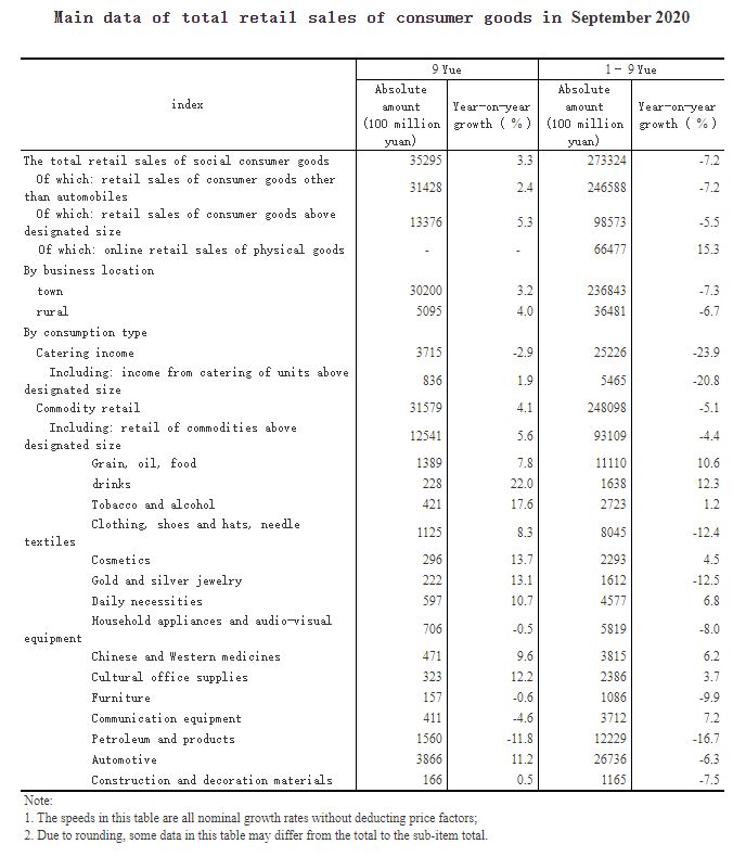 The growth internals for September were 1.2% for industrial production YTD, fixed asset investment 0.8% YTD and retail sales -7.2% YTD but 3.3% YOY: