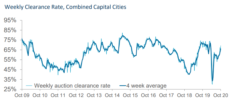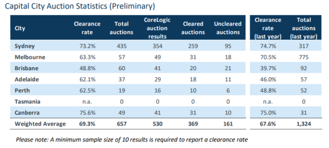 CoreLogic’s preliminary auction clearance rate softened, with 69.3% of reported auctions cleared versus 70.5% last weekend: