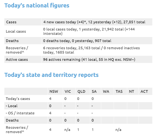 It’s a good day for Australia with only 4 new COVID-19 infections recorded overnight, none of which were locally acquired: