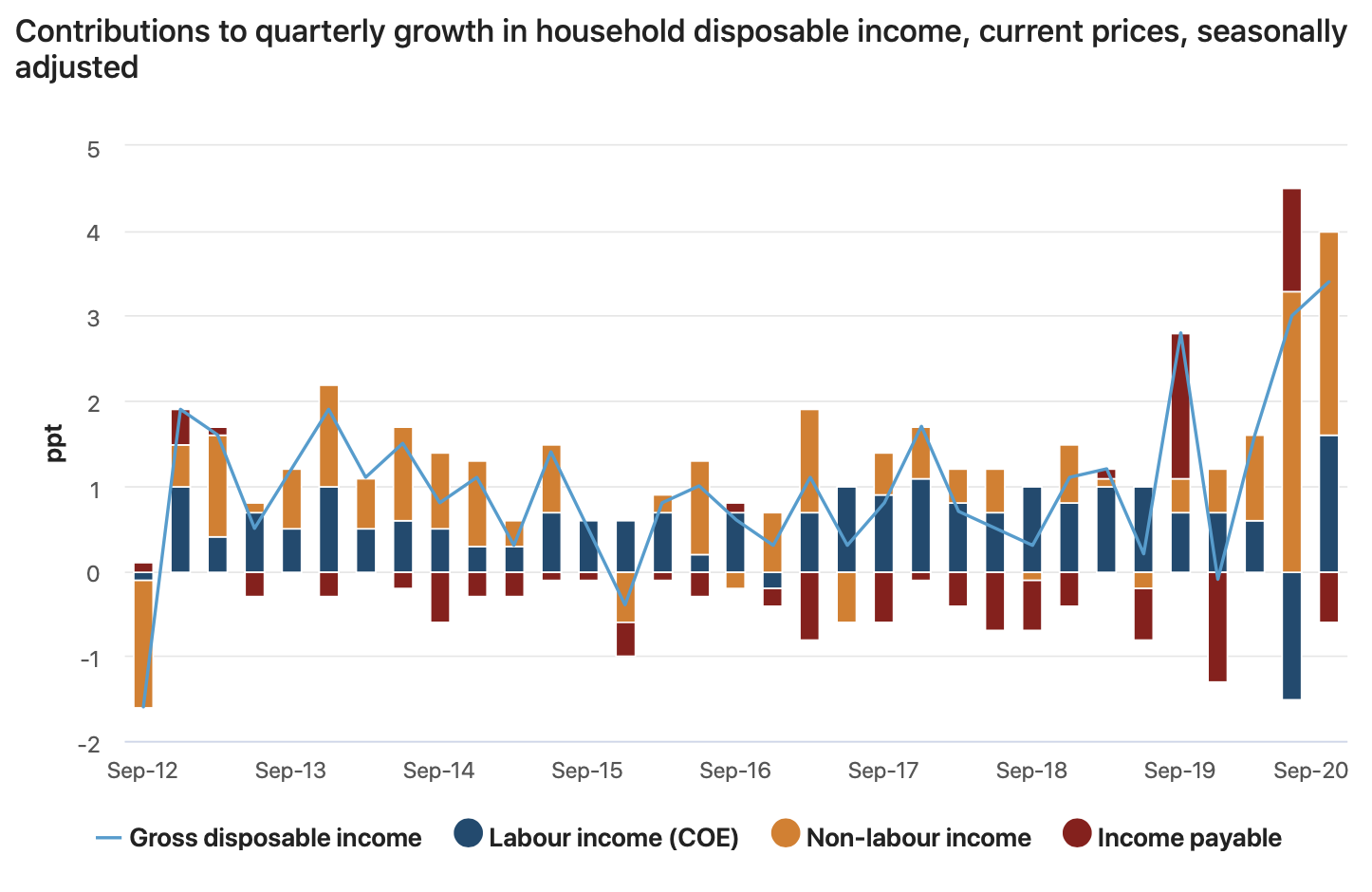 Since there have been few spending options for all that extra income, the household savings rate has boomed. Households have spent $121 billion less than they earned so far this year. We can see just how much the income to households from stimulus spending has exceeded declines in incomes in the chart below. The orange bars are how much non-labour income, which includes government payments, contributed to growth in total household income. In short, disposable incomes are up massively and the main reason is the stimulus cash given to households.