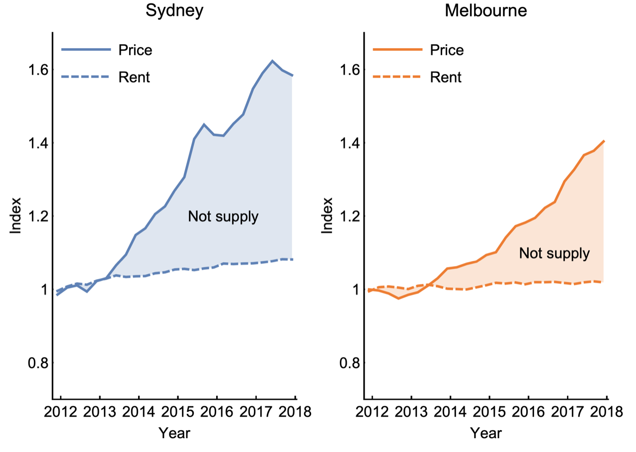 If recent sale price changes are not due to rents, then they must be due to one of the other ingredients in the asset pricing model. We can eliminate the ongoing costs of upkeep. Construction costs have been steady, and fixed fees and charges also have seen little variation. Property tax rates are also relatively unchanged, at least in Australia. Note also that higher property taxes reduce asset prices.