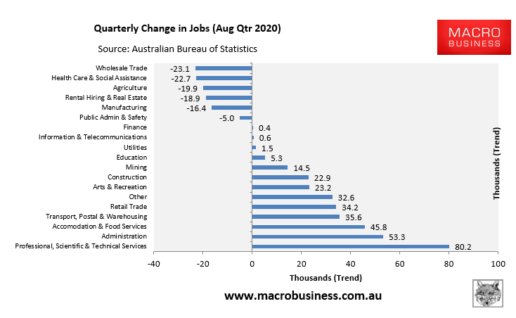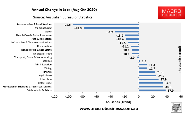 However, in the year to November 2020, 79,200 jobs were lost, still dominated by Accommodation & Food Services (-93,600), followed by Manufacturing (-78,000) and Other (-33,900):