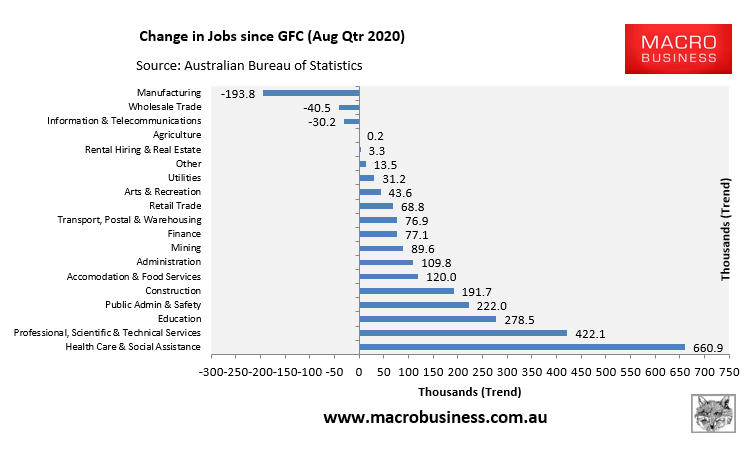 Finally, the next chart plots the change in jobs since the Global Financial Crisis (GFC) hit in August 2008. Over this period, 2,112,500 jobs have been created, driven by Health Care & Social Assistance (+660,900), Professional, Scientific & Technical Services (+422,100), and Education (+278,500), with Manufacturing losing the most jobs (-193,800):