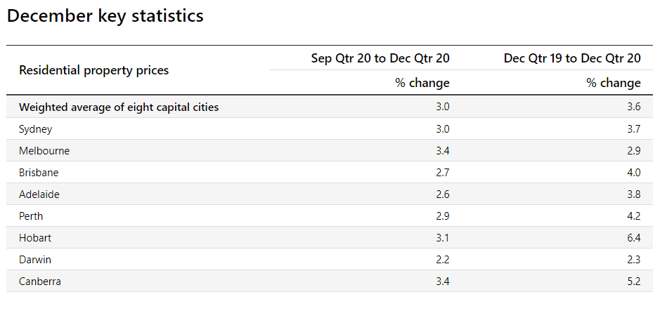 The Australian Bureau of Statistics (ABS) has released residential property price indices for the December quarter of 2020, which revealed booming price results across all capitals.