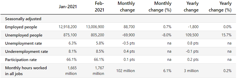 The ABS has released labour market data for February, which revealed that Australia’s unemployment rate fell to 5.8% (from 6.3% in January) following strong jobs growth of 88,700:
