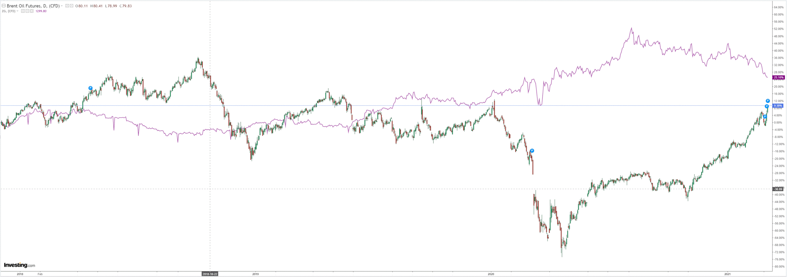 Brent oil surged as OPEC grasps at its share of the recovery. Gold is going lower as yields rise: