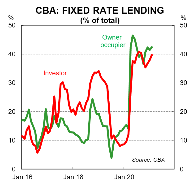 The share of fixed rate lending remains near historical highs for both owner-occupiers and investors. Fixed rates are generally lower than variable rates at the moment.