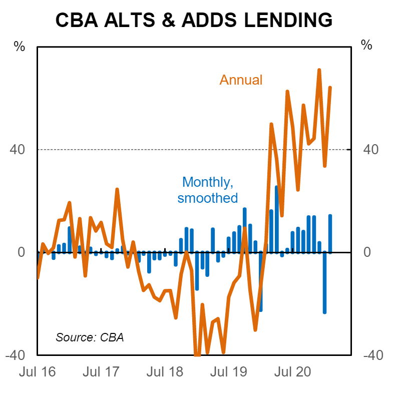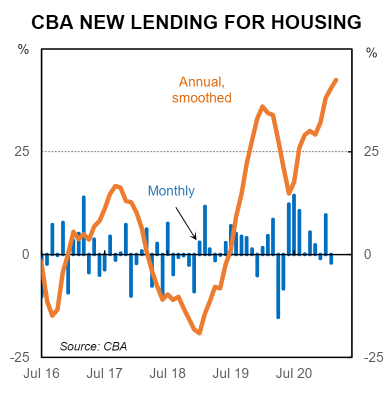 CBA’s data shows new lending for housing took a breather in February after very strong growth in January. New lending has been growing at a strong pace since mid 2020.