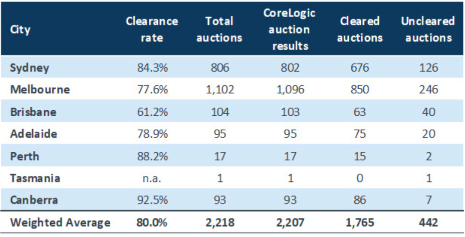 CoreLogic’s final auction report for last weekend is in with the national clearance rate remaining at 80.0% – exactly the same as the prior weekend and the highest level since April 2015: