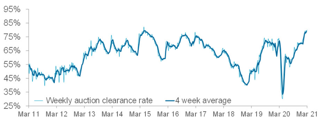 Like last week, Sydney led the way recording a final clearance rate of 84.3% off 806 auctions – the sixth consecutive week above 80%. Melbourne’s final clearance rate was also strong at 77.6% off 1,102 auctions. Whereas the other capitals, where auctions aren’t nearly as prevalent, were also solid to strong.
