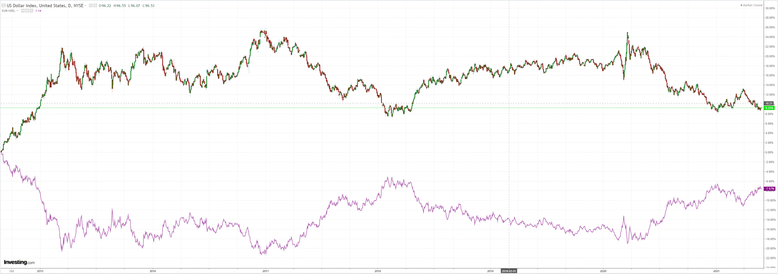 We’ve been expecting a pop in US inflation over Q2 and it did not disappoint. DXY rallied as EUR fell and AUD was clobbered. That said, US yields fell, indicating that markets were expecting higher still. DXY versus EUR: