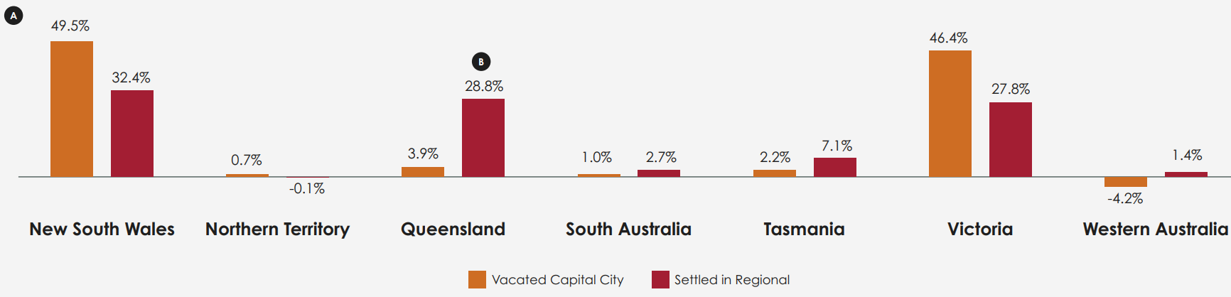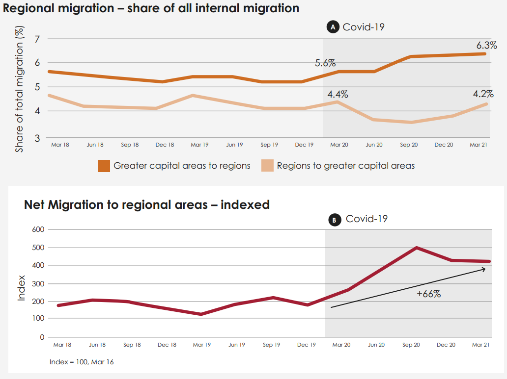 Regional NSW and Regional Queensland are the main beneficiaries of the Sydney-Melbourne exodus, followed closely by regional Victoria. These states’ regional areas accounted for the largest shares of people settling in regional areas in the March 2021 quarter (32.4 per cent, 28.8 per cent and 27.8 per cent, respectively).