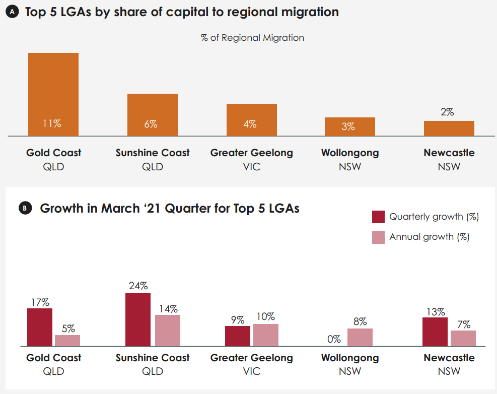 The Sunshine Coast recorded the largest growth in migration from capital cities compared with the other Top 5 LGAs. Migration to the Sunshine Coast grew by 24 per cent in the March 2021 quarter, and by 14 per cent over the year.