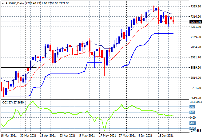 Australian stocks were very unsettled due to widening COVID restrictions with the ASX200 about to put in a scratch session just above 7300 points. SPI futures are down nearly 20 points despite the new highs on Wall Street with momentum readings in a neutral positive setting with a possible bounce off trailing ATR support at 7150 points fading if we get another daily low finish:
