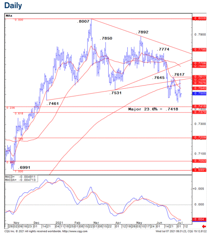 As above, we still look for “neckline” resistance at .7597/7617 to cap. Above here would suggest a deeper rally, with the next resistances seen at .7642/45, then .7688/7706, above which would make the top much less compelling. Our bias stays lower, with key support at .7418 next. A close back above .7617 would neutralise our bearish view.