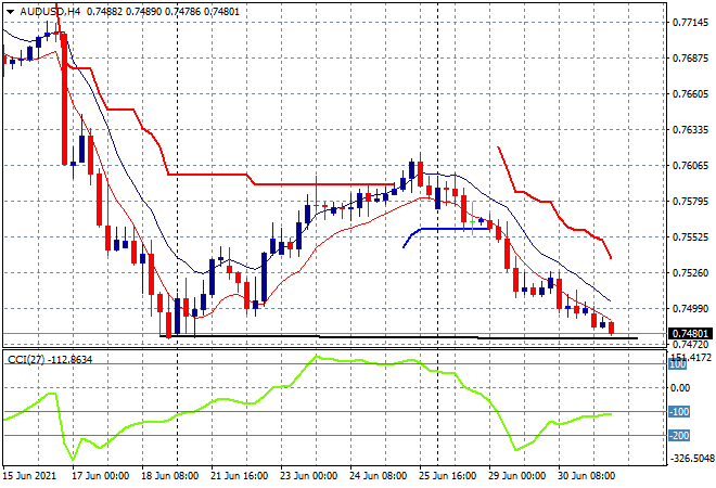 Australian stocks have moved from unsettled to concerned due to the widening COVID crisis with the ASX200 losing nearly 0.7% to close below the 7300 point level at 7265 points. Meanwhile the Australian dollar remains under pressure, unable to find buying support at the 75 handle as it breaks below and matches the previous weekly low leading up to tomorrow night’s NFP print: