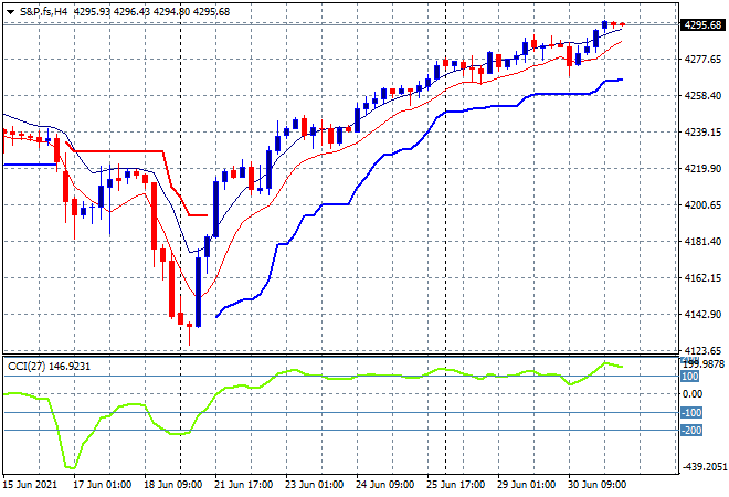 Eurostoxx and S&P futures are climbing slightly going into the London session with the four hourly chart of the S&P500 showing price wanting to head onwards to 4300 points although momentum is waning and market breadth is a key problem: