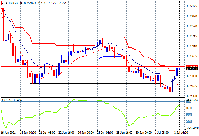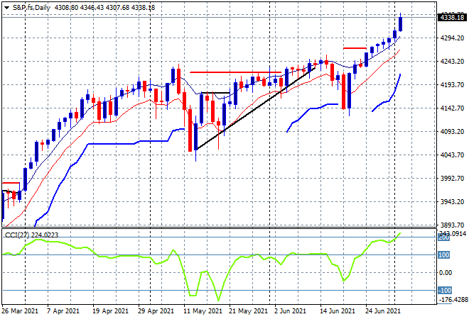 Wall Street loved the good but not so good unemployment print with tech stocks leading the way, the NASDAQ up 0.8% while the S&P500 pushed to a new record high, up 0.7% to 4352 points. The daily chart shows how momentum has picked up strongly again into extreme overbought mode so this trend is more and more supported as there are no more sellers available: