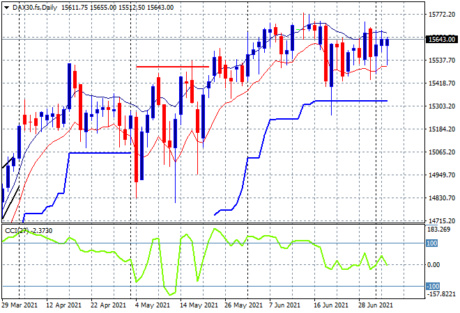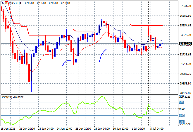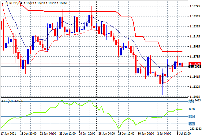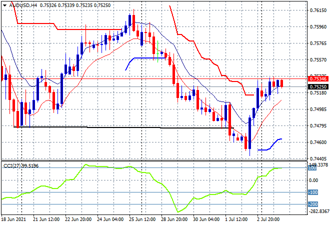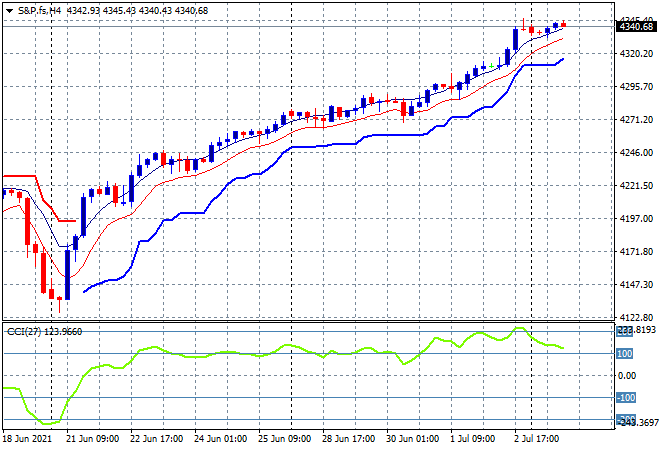 Wall Street was closed for the July 4th holiday long weekend with futures indicating the S&P500 pushed to a new record high, up 0.7% to 4352 points. The four hourly chart shows momentum retracing ever so slightly but this is likely to pick up again into an outright overbought mode on the return of US traders tonight for yet more upside: