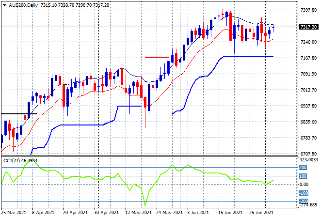 Australian stocks shuffled along without much direction, with the ASX200 closing up only 6 points higher to remain just above the 7300 point level. SPI futures are up nearly 15 points despite the lack of a lead from Wall Street as traders await the RBA response today. Momentum readings remain in a neutral positive setting with a bounce off trailing ATR support at 7150 points is still possible: