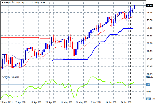 Oil prices have pushed aside overheard resistance as the OPEC+ meeting remains unforced with Brent crude able to close at the $77USD per barrel level last night for a new high as supply doesn’t seem imminent at all. Price remains strongly supported in this uptrend, with momentum nicely overbought and not too far overextended, with the 2018 high at $83 looking better and better each day: