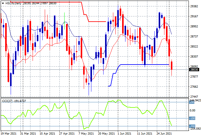 Looking at share markets in Asia from yesterday’s session, where the Shanghai Composite sold off at the start but managed a swift rally at the close, finishing 0.4% higher at 3534 points while the Hang Seng Index continued going south, down 0.6% to 28143 points. This sets up a breakdown below daily ATR support at the 28100 point level that could overshoot to the May lows: