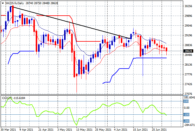 Japanese stocks were in a similar boat with the stronger Yen not helping as the Nikkei 225 loses 0.6% to close at 28598 points. Daily futures continue to suggest more flat to declining sessions ahead as heavy resistance remains at the 29000 point level with a stronger Yen on Friday night not helping here: