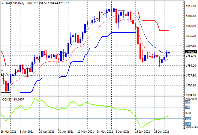 Gold is finding some life here after being in the doldrums for several weeks now below the $1800USD per ounce level with another advance and new daily high to close at the $1791USD level overnight. Another big move above above the high moving average could see a bounce back to previous ATR support at the $1840 level but would require a lot more USD weakness: