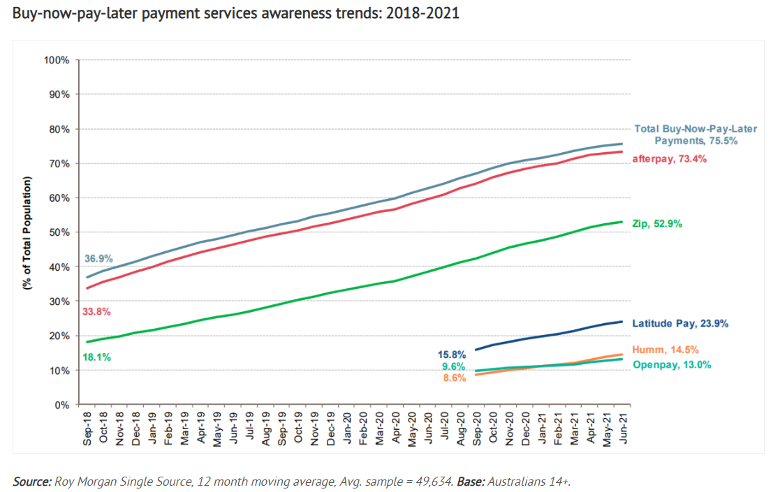 Afterpay is the clear market leader with nearly three-quarters of Australians, 73.4%, aware of the service in the year to June 2021, up 3.4% points since February 2021, and up 39.6% points since September 2018.