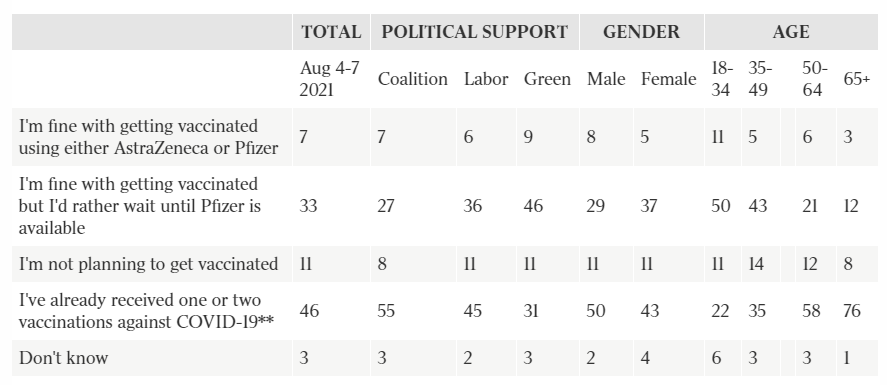 The poll, conducted between August 4 and August 7, suggests 86 per cent of voters had either been vaccinated or were planning to get jabbed compared, with 75 per cent six months ago before the Delta strain hit Australia.
