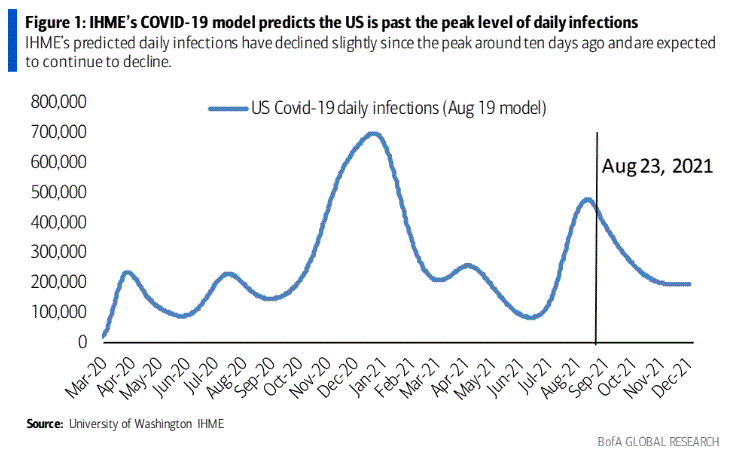 Evidence–such as the University of Washington’sIHME model–suggests the US is now past the peak level of dailyCOVID-19infections caused primarily by the Delta variant. While daily new cases–a subset of new infections–also showed a small decline yesterday (to 147,294 from 147,550the prior day, 7-day average), keep in mind this data is noisier due to varying levels testing activity and potentiallyHurricane Henri. The much cleaner data for number of people hospitalized withCOVID-19 rose just 7.8% the past week which, due to its lagged nature and very rapid pace of decline, is consistent with the US being past peak level infections. Moreover the recent one-point decline in theCOVID-19 test positive rate to 9.32%–another indicator we are past peak level infections–highlights one driver of high daily case counts is merely more testing activity.