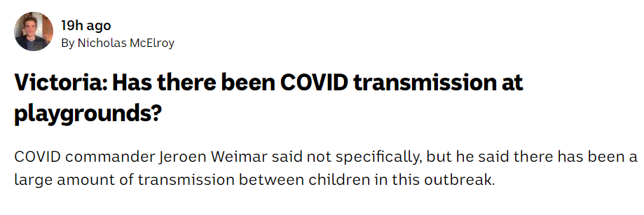 Whereas Victorian COVID commander, Jeroen Weimar, yesterday admitted there is no concrete evidence that virus has been transmitted at playgrounds, according to the ABC: