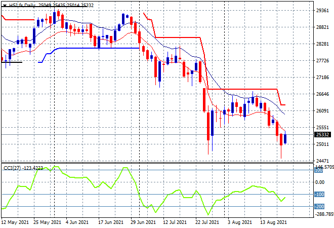 Looking at share markets in Asia from yesterday’s session, where the Shanghai Composite took back its Friday losses, closing 1.4% higher to close at 3476 points while the Hang Seng Index was almost as bullish, up 1% to close at 25109 points. The daily chart still looks quite bearish after returning to the previous monthly low at 25000 points but yesterday’s session maybe the start of a double bottom pattern. However, momentum has not yet gone into swing long mode with price action still below the low moving average so early days yet: