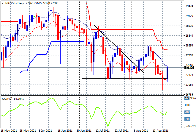 Japanese stocks did even better with the Nikkei 225 finishing nearly 2% higher at 27494 points, after previously breaking through weekly support. This is a very solid bounce off the bottom of the previous descending triangle pattern as daily momentum got quite oversold but that series of intrasession buying – the long undertails on previous daily candles – had suggested support building at the 27000 point level. I remain cautious here but watch for a close above the high moving average as the next stage: