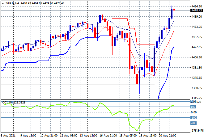 Wall Street had another strong session across the board, dominated by tech stocks with the NASDAQ gaining nearly 1.6% while the S&P500 lifted more than 0.8% to get back to its previous historic high at 4479 points. The four hourly chart shows how well the BTFD crowd works, bouncing off the 4360 weekly support level and then pushing it sky high as the FOMO trade takes it well above the 4400 psychological level and back to the record high trend. Don’t fight the Fed: