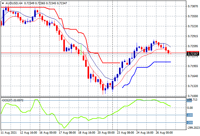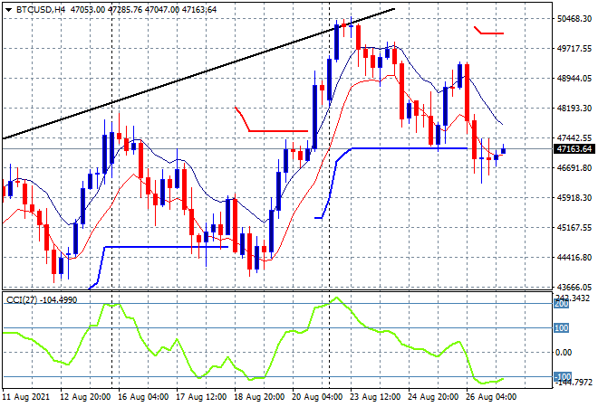 Gold whipsawed around but not above the key $1800USD per ounce level overnight on the back of the Fed tapering missives, still running out of momentum as it retraces back to four hourly support at the $1790 level. While previous resistance has been pushed aside, the question still remains if it can make it back to the mid July $1830 highs as daily momentum is nowhere near overbought and ready for a proper rally: