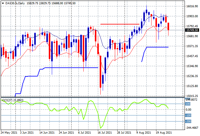 Australian stocks were unable to escape the selloff, not helped by the disastrous NSW COVID breakout with the ASX200 losing 0.5% to fall below the 7500 point level. SPI futures are down another 10 points in response to the falls on Wall Street overnight but the daily chart is broadcasting a greater dip is likely to eventuate, as price has been unable to clear its own high moving average here with ATR support at the 7360 point level the target:
